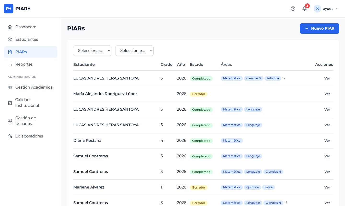 PIAR+ incluye un asistente de IA que genera una propuesta inicial de ajustes basada en el diagnóstico del estudiante.