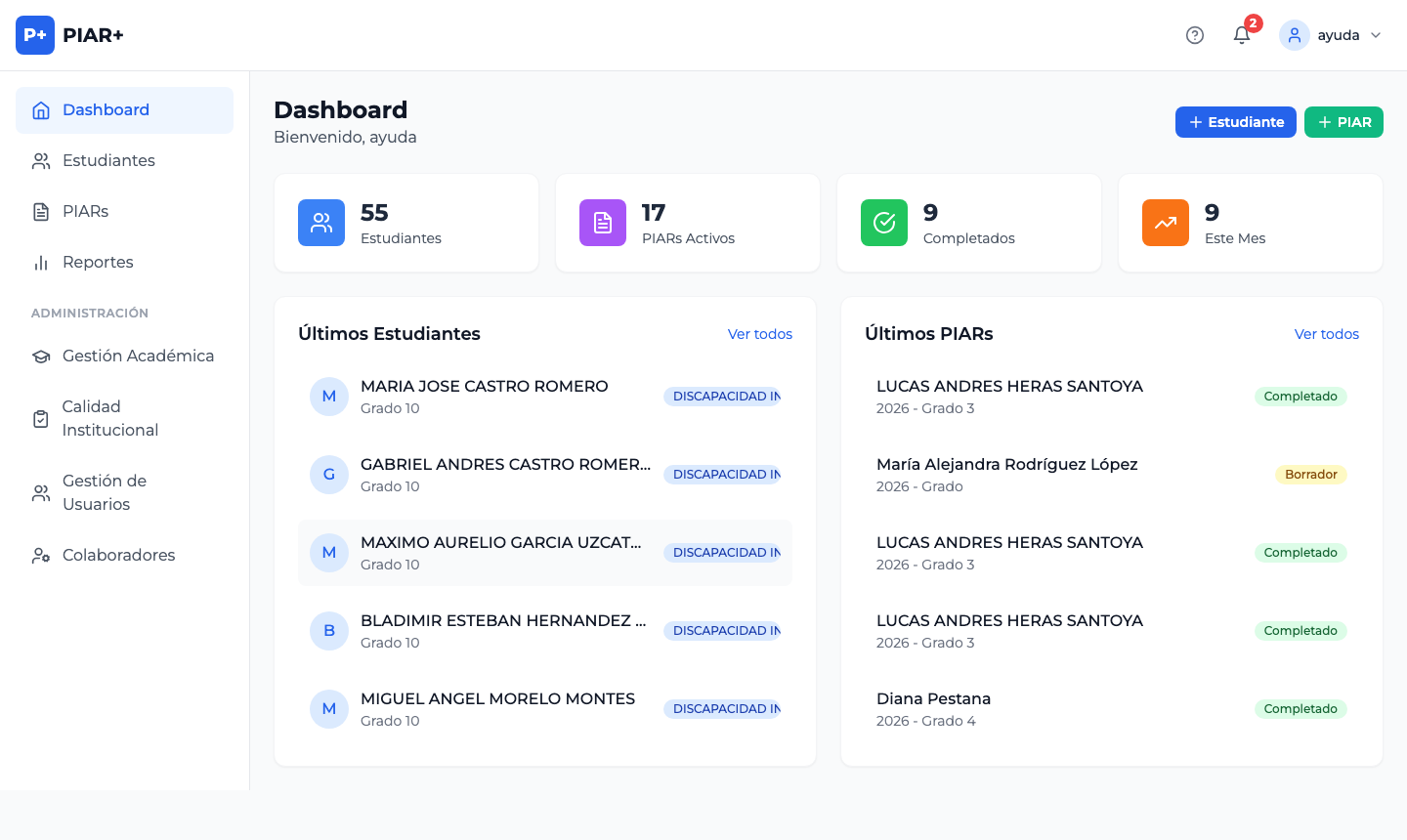 | Sección | Para qué sirve | |---------|---------------| | 🏠 Inicio | Resumen y accesos rápidos | | 👩🎓 Estudiantes | Listado, registro e importación de estudiantes | | 📋 PIARs | Crear y gestionar Planes Individuales | | 📊 Reportes | Generar reportes en PDF y Excel | | ✅ Calidad | Módulo de autoevaluación institucional |