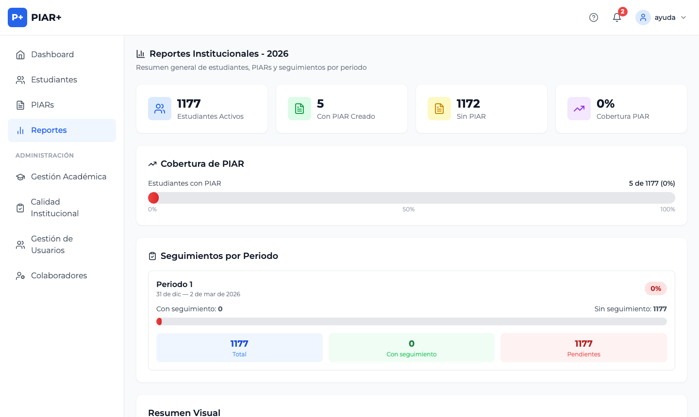 Este reporte es útil para monitorear el avance y priorizar a los estudiantes que aún no tienen su PIAR elaborado.